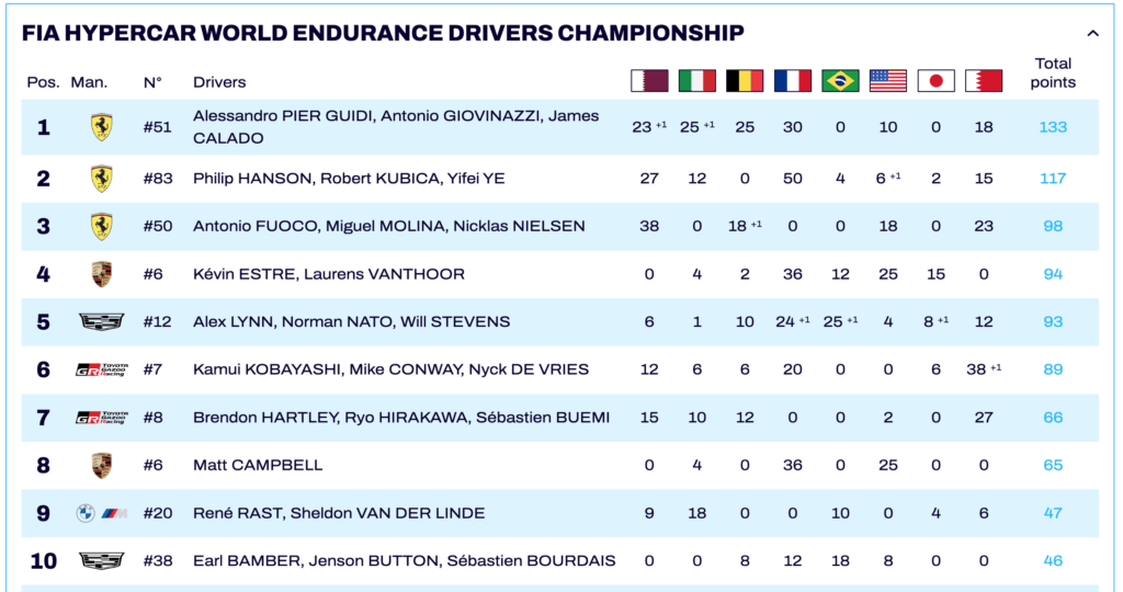 Per la prima volta nella top-class “Hypercar”, Ferrari vince il titolo Piloti (con l’equipaggio della #51: Pier Guidi / Calado / Giovinazzi). Il Costruttori 2025 è suo per la nona volta assoluta, e la prima dal 1972.