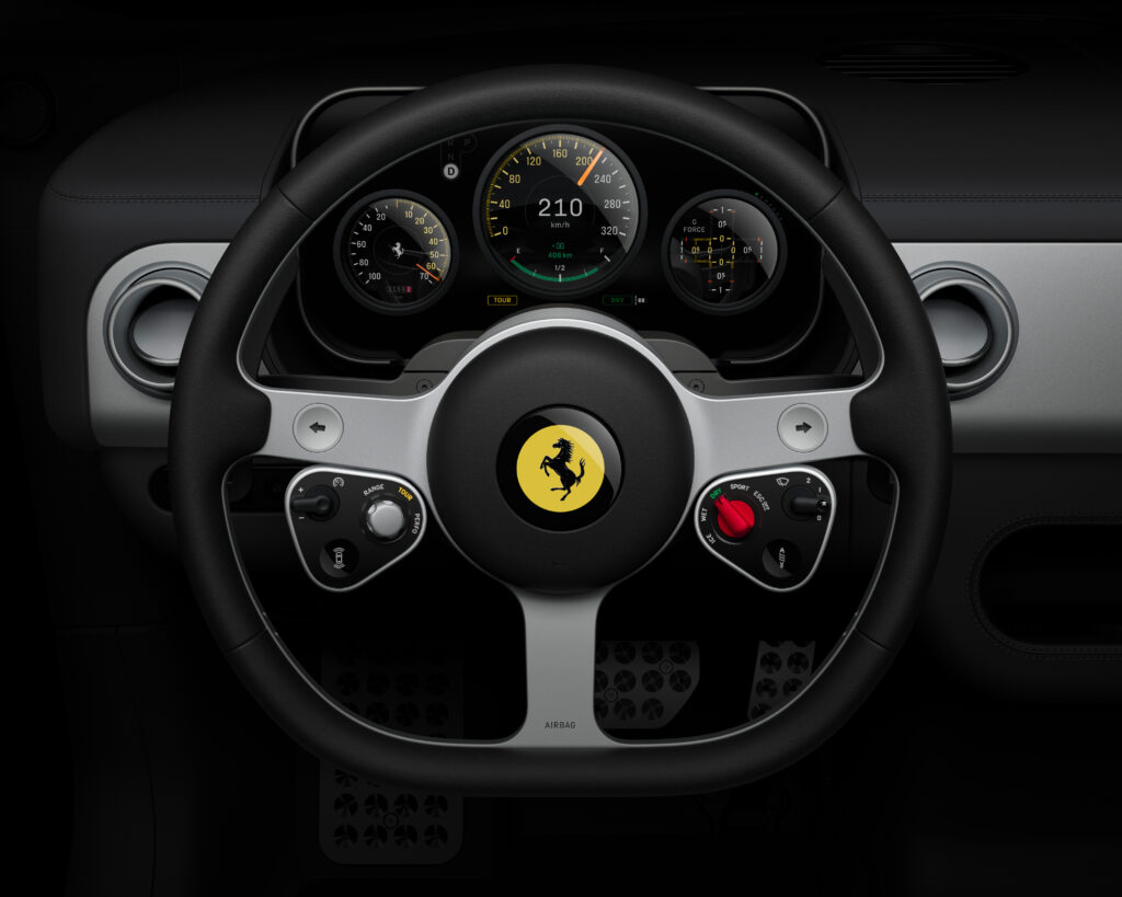 E soprattutto: tutto è sul volante, come deve essere su una Ferrari. Non touch a caso, ma comandi che senti sotto le dita, organizzati con una logica quasi da Formula 1. Da una parte le modalità di potenza e l’e‑manettino (Range, Tour, Performance), dall’altra comandi per telaio, sospensioni e tergi, organizzati come su un volante di Formula 1.