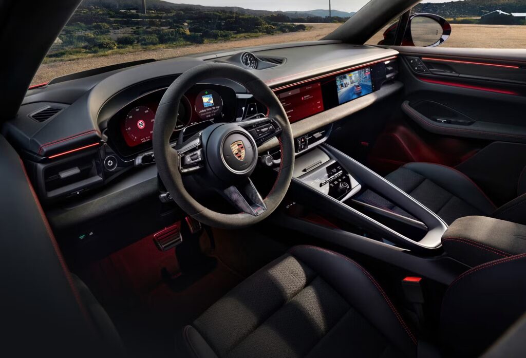 Cruscotto a tre schermi (12,6” cluster curvo, 10,9” centrale PCM, 10,9” passeggero), connettività CarPlay/AA wireless, comandi vocali “Hey Porsche”, OTA. Pacchetto Interno GTS: Race-Tex, cuciture a contrasto (Carminio, Blu, Grigio), inserti carbon; sedili sportivi a 18 vie.